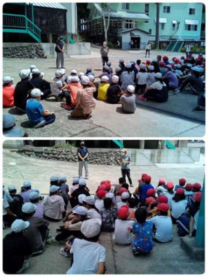 部屋割りのあと、避難訓練を行いました。もしもの時の避難経路の確認をして、すばやく集合しました。