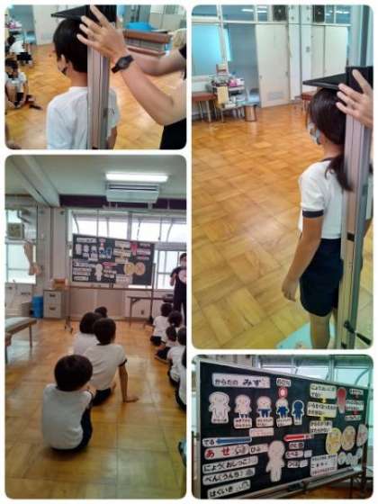 保健室で「水分の大切さや熱中症の予防について」お話を聞きました。そのあと、発育測定をしました。