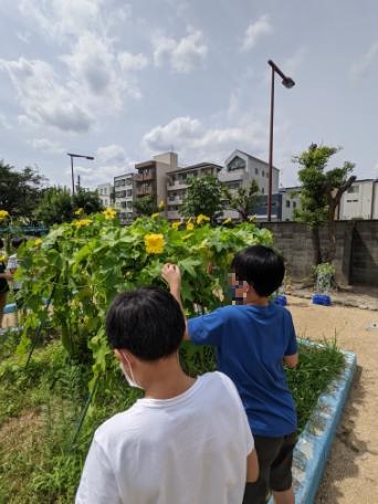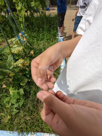 ヘチマの花から花粉をテープで採取し、顕微鏡で観察しました。