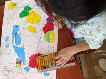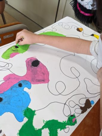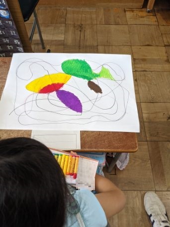 マジックペンで画用紙いっぱい、自由に線を引きました。できた線の交わりを動物や食べ物に見立てて色を塗りました。
