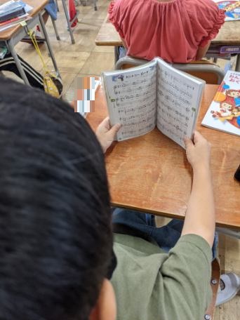他にも、カントリーロードや勇気100%を本を見ながら聞きました。