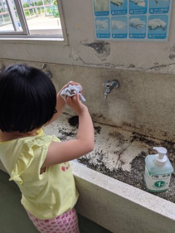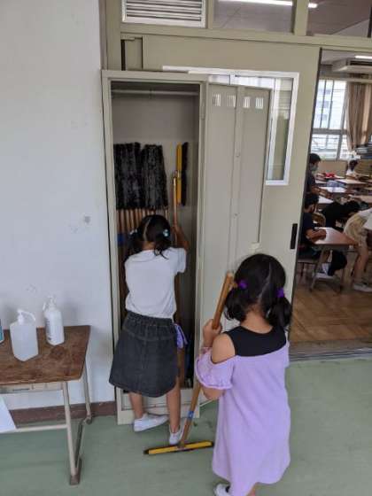 ぞうきんもしっかり絞って、掃除用具入れもきれいにほうきを並べて片付けができています。
