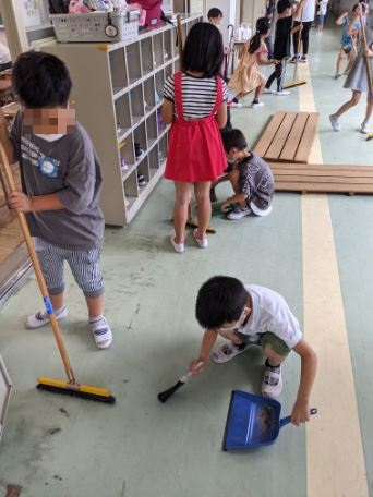 ゴミを集まってきたら、ちりとりを持ってきて、すのこは二人で運びます。すっかり掃除の進め方が分かっているので、協力して取り組むことができています。