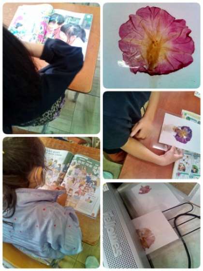 生活科の学習です。みんなで育てたアサガオを「押し花」にしました。