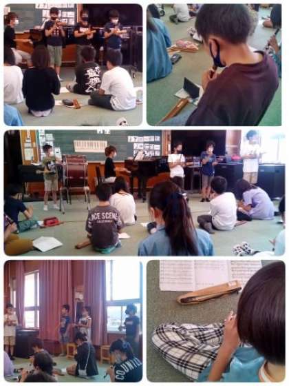 音楽の時間の様子です。「いつも何度でも」の曲をウッドブロックや鈴、大だいこでリズムをとりながら、全員で合奏しました。