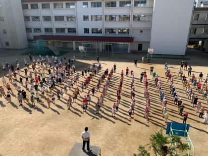 緊急事態宣言が解除となり、半年ぶりに運動場で朝会を行いました。