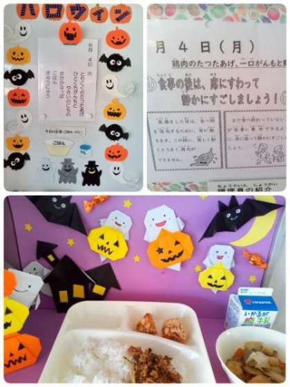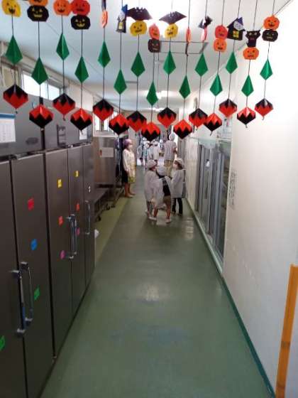 給食調理員さんが、給食室にハロウインの飾りを作ってくださいました。とてもきれいですね。