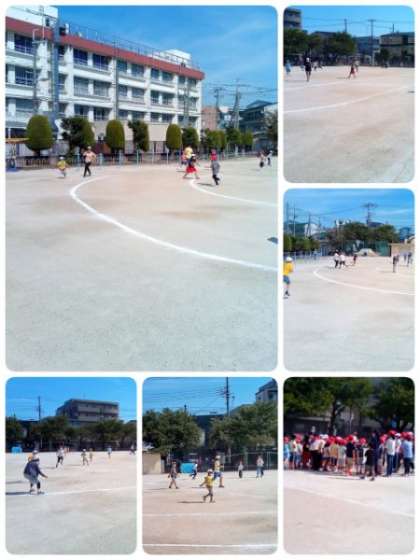 昼休みに南運動場をのぞいてみたら、1年生と6年生が元気いっぱいに走り回っていました。6年生が1年生と一緒に「ふえおにごっご」をしています。みんな広い運動場を思いっきり走りました。