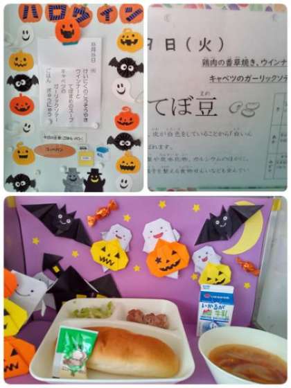 今日の献立は、「鶏肉の香草焼き」「ウインナーとてぼ豆のスープ」「キャベツのガーリックソテー」「ソフトマーガリン」「コッペパン」「牛乳」です。