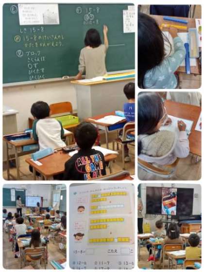 「15−8の計算の仕方をかんがえよう」をめあてに、それぞれがブロックやさくらんぼ図など、自分で考えた方法で問題を解きました。