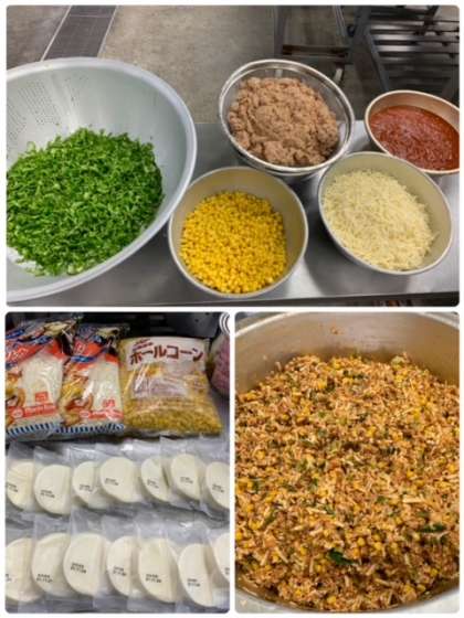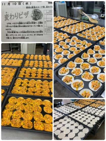 今日の献立は、「豚肉と野菜のスープ煮、変わりピザ、みかん、黒糖パン、牛乳」です。