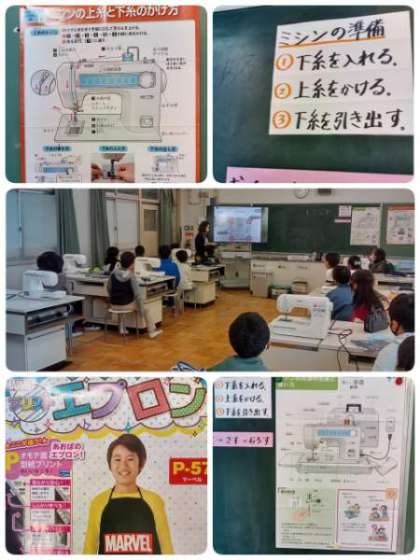 5年生の家庭科です。エプロンづくりをしました。アイロンを当てたあと、三つ折りにしてミシンを使いました。まっすぐ縫うように緊張しながら縫っていました。素敵なエプロンが完成しますように。