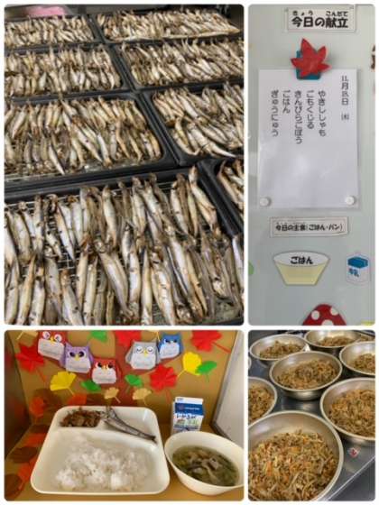 今日の献立は、「焼きししゃも、五目汁、きんぴらごぼう、ご飯、牛乳」でした。