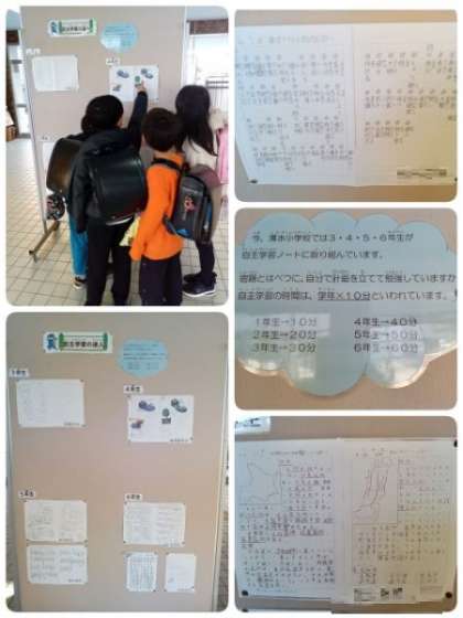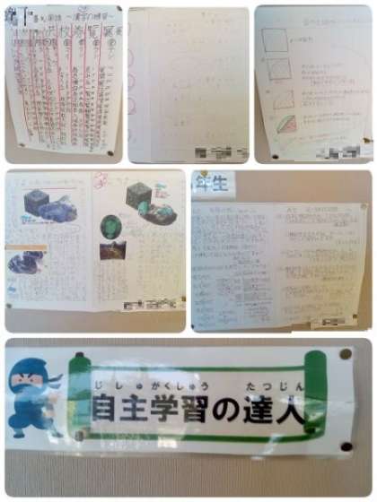 玄関前に「自主学習ノート」を頑張っている人のノートを展示しています。よいところを参考にして、挑戦してみてくださいね。