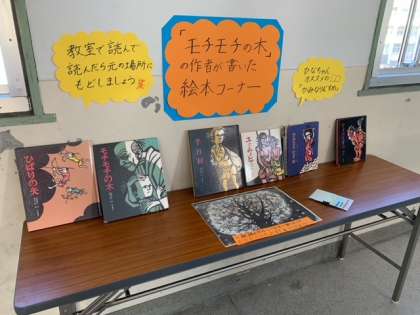作者である斎藤隆介の他の作品も廊下に並べて読書をすすめています。