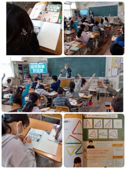 3年生の算数です。長さの違ったストローで作った三角形を仲間分けしました。