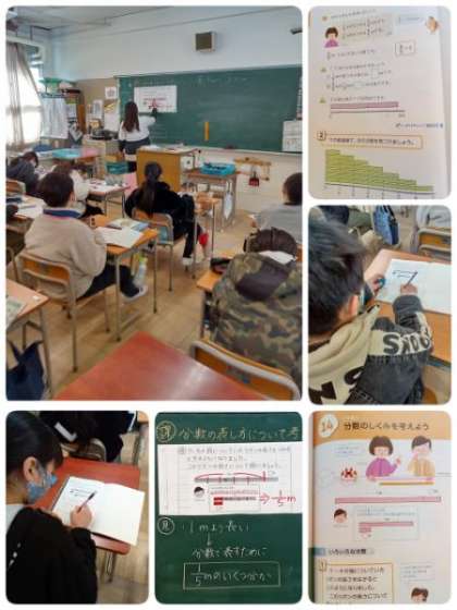 4年生の算数の時間です。「分数のしくみについて考えよう」の学習です。今日は、1より大きい分数の表し方について考えました。