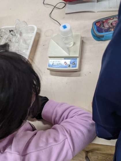 食塩と水を混ぜて食塩を溶かすのに班で協力しますが、混ぜるのに疲れてしまったようです。