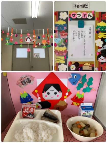 給食室の掲示も節分にちなんだかわいい飾りに変わりました。