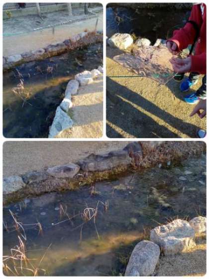 とても寒い日が続きます。ビオトープの池を見てみると、氷が張っていました。触ってみると、とても冷たかったです。
