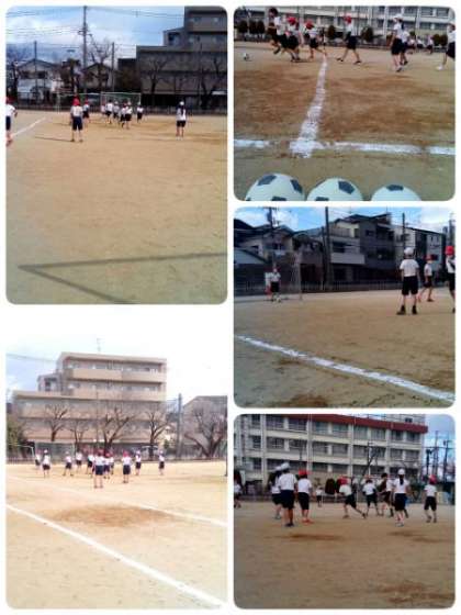 5年生の体育、ミニサッカーをしています。声をかけながら、パス回しをして、ゴールを目指します。