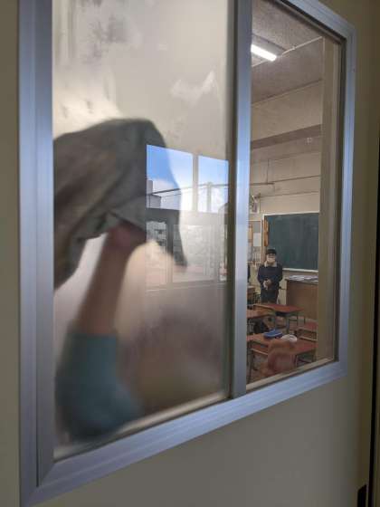 ぴょんぴょんぴょんと教室のドアをジャンプをしながら拭いたり