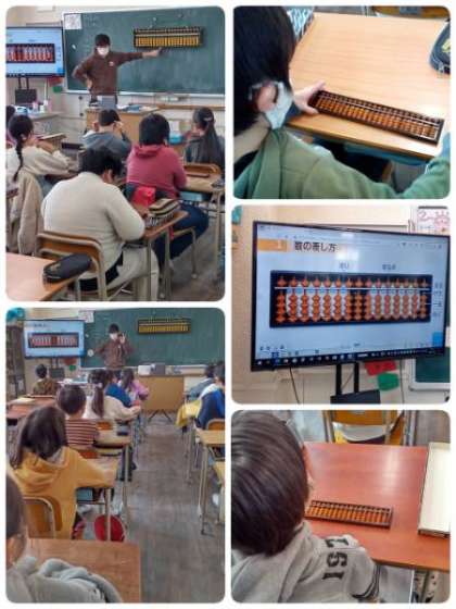 3年生の算数です。「そろばん」の学習をしました。「はり」「定位点」「五玉」「一玉」「けた」「わく」など、そろばんの各部分の名前を覚えた後、実際に数字を入れてみました。少しでも揺れてしまうと、ずれてしまうので「難しいなあ」という声も聞こえてきました。