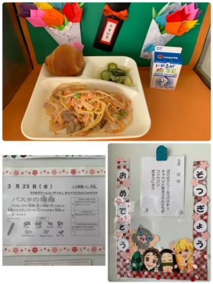 献立は、「鮭のクリームスパゲティ、キャベツときゅうりのサラダ、コッペパン、牛乳」でした。最後もおいしく完食です。