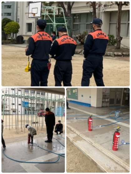 今回は水を使ってですが、消火器の使い方を学び、上手に扱うことができていました。