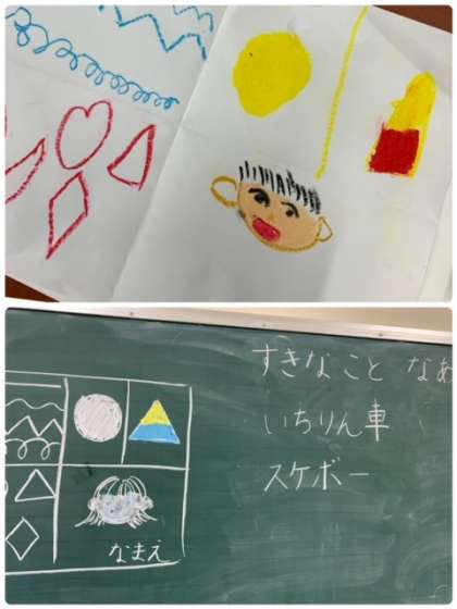 2年生は、紙を4つに分けて自分の似顔絵や好きなことを書き込んでいました。