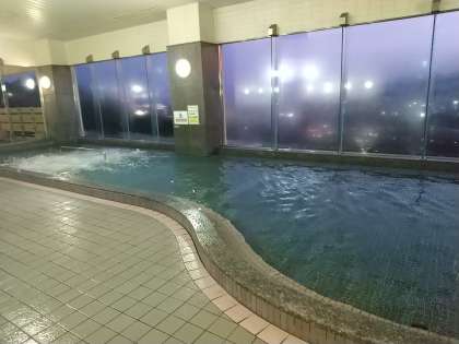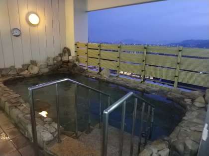 天然温泉。夜景のきれいな露天風呂付きです。子どもたちも期待が膨らんでいる様子。
