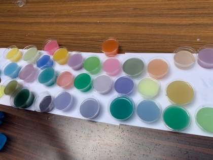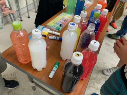 たくさん集めたペットボトルに色水を加えていきます。
