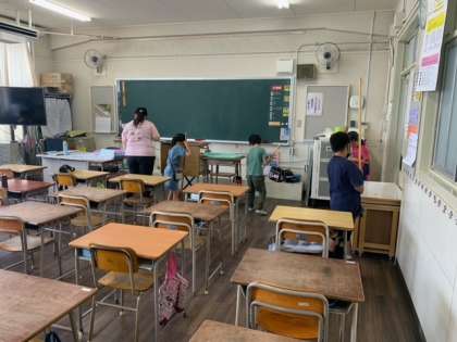 大掃除をするクラス、平和集会の群読を練習するクラス、夏休みの宿題を確認するクラス。