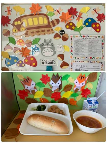 給食室も秋らしく、紅葉や栗、きのこ、そしてトトロと仲間たちの掲示になっています。