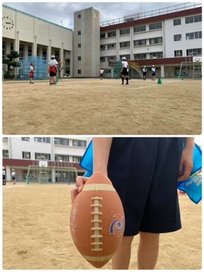 やわらかいラグビーボールと、2枚のフラッグを腰につけて取り組む内容です。
