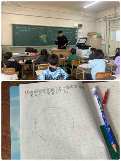 3年生の教室では、習熟度別のクラスに分かれて円を使った作図問題に取り組んでいました。