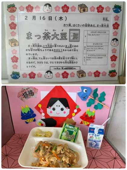 今日の給食は、「カツ丼、はくさいの甘酢あえ、まっ茶大豆、牛乳」でした。
