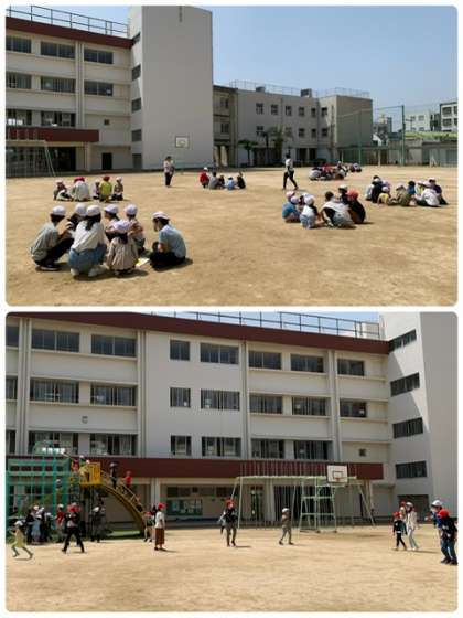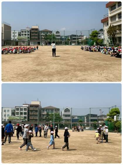 6年生が班の1年生を集め、自己紹介をしたり、一緒に遊んだりして、1年生が自分の班や班のリーダーを覚えられるよう交流をしました。