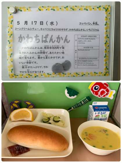 今日の給食は、「コーンクリームシチュー、キャベツときゅうりのサラダ、かわちばんかん、コッペパン、牛乳」でした。