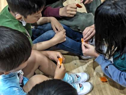 広島に飾るための鶴と亀を、6年生が1年生に教えながら一緒に折りました。1年生は初めて折る子も多かったですが、6年生のお兄さんお姉さんが優しく丁寧に教えてくれたおかげで、折ることができていました。