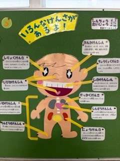 北館1階にある保健室。その前の掲示板には、毎月季節や行事に合わせた掲示がされています。