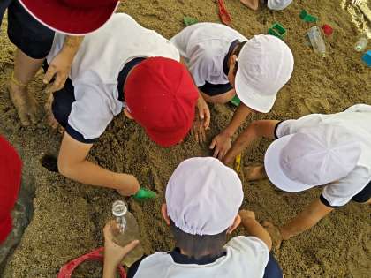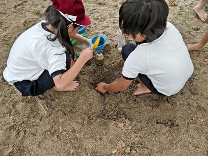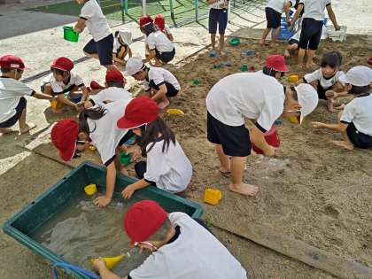 深く深く穴を掘る子や、バケツに溜めて山を作る子、綺麗な泥団子を作る子に、先生に泥を投げる子…。お友だちと一緒に泥の感覚を味わいながら楽しみました。