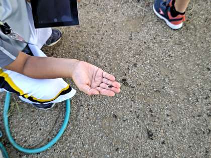 2年生が生活科で、朝の涼しいうちに、虫取りをしました。