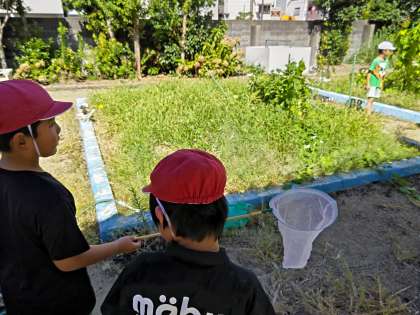 草むらの中やブロックの下からバッタやダンゴ虫を見つけたり、蝶々やトンボを網で捕まえようと追いかけたりしました。捕まえた虫たちは、観察をした後、自然に戻りました。
