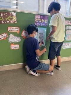 子どもたちが、靴ひもを結ぶ練習をしていました。