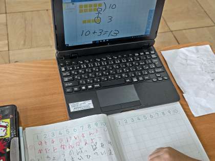 1年生は、繰り上がりのある足し算の学習に入っています。計算の手段を考える時間では、一人一台端末にある発表ノートに、ブロックを置いたり、文字を書き込んだりして自分の考えを表出しています。