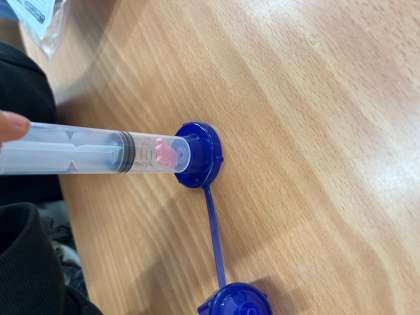 とじこめた空気を押すと体積が小さくなることがわかるように、スポンジを中に入れて動きを確かめました。