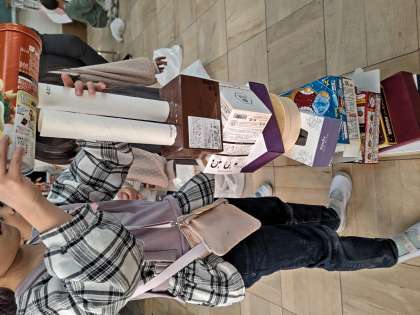 算数では、お家から持ってきた様々な形の箱を使い、かたちしらべをしています。今日は、班ごとに分かれて、箱を高く積み立てました。作戦タイムでは、「長い箱は立てて使おう」「軽いのは最後に置こう」等、様々な工夫をしていました。
