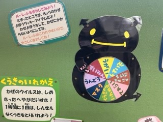 「今日のラッキー風邪予防はなにかな?」と話しながら、友だち同士でルーレットを回しています。