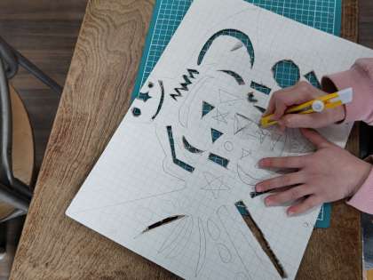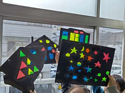 △や○の形をカッターで切り抜き、カラーフィルムを貼りました。不慣れなカッターに苦戦する場面もありましたが、集中して切り抜くことができました。お家に持って帰ったら、光に当ててみてください。